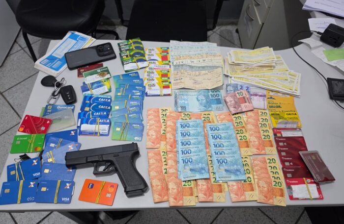 No imóvel, foram apreendidos 53 cartões magnéticos de benefícios sociais e de instituições bancárias, além de mais de R$ 2 mil em espécie, um simulacro de arma de fogo e documentos como cheques e notas promissórias assinadas por vítimas.