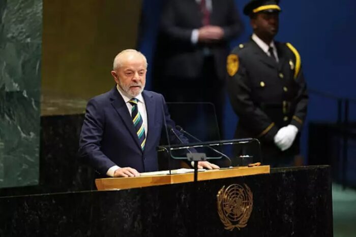 “Este deveria ser um momento de celebração das Nações Unidas”, disse Lula no início de seu discurso. “Hoje, contudo, os ideais que inspiraram sua fundação estão ameaçados como nunca estiveram. O multilateralismo está diante de nova encruzilhada. A autoridade dessa Organização está em xeque. Atentados à soberania, sanções arbitrárias e intervenções unilaterais estão se tornando regra”, acrescentou.