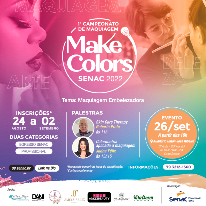 Os profissionais da maquiagem estão com a oportunidade de mostras seu talento no campeonato Make Color Senac que está com inscrições abertas até sexta, 02, às 23h59. Os interessados devem realizar sua inscrição através de formulário online disponível no site www.se.senac.br e enviar duas fotos de tamanho 20x25cm cada, em formato JPG com 300DPI de resolução com uma ou duas produções para o e-mail eventos@se.senac.br com as seguintes informações: nome completo e e-mail. A competição conta com duas categorias: egresso Senac e profissionais. As dúvidas podem ser retiradas na Central de Atendimento pelo 3212-1560.