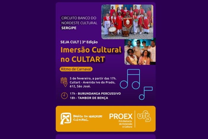 O Centro de Cultura e Arte da Universidade Federal de Sergipe (Cultart/UFS) realiza, na próxima quinta-feira (5), a partir das 16h30, a terceira edição do projeto Seja Cult, iniciativa que celebra a cultura popular, a música e o encontro entre diferentes expressões artísticas, reafirmando o espaço como referência na valorização da produção cultural sergipana.